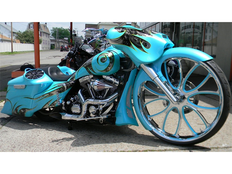 2006 FLHX Ground Up. Misfit Industries short neck, 30in wheel. MMATS Professional Audio stereo. On Demand air ride. Top Shop Bagger Products ass end. Ballistic Cycles Gangsta Glide fairing. Diamond cut engine. Seat by Guys Upholstery, and to much to list.