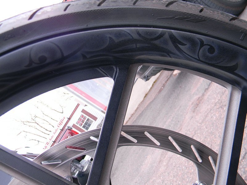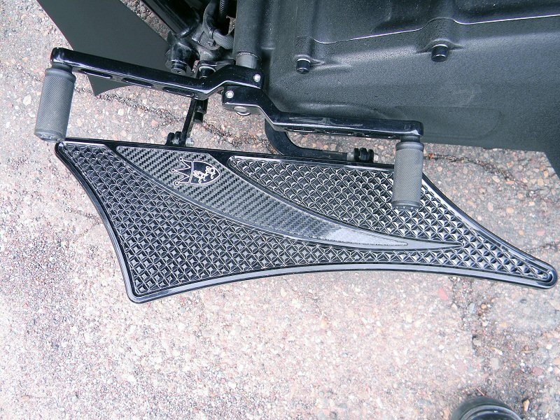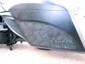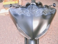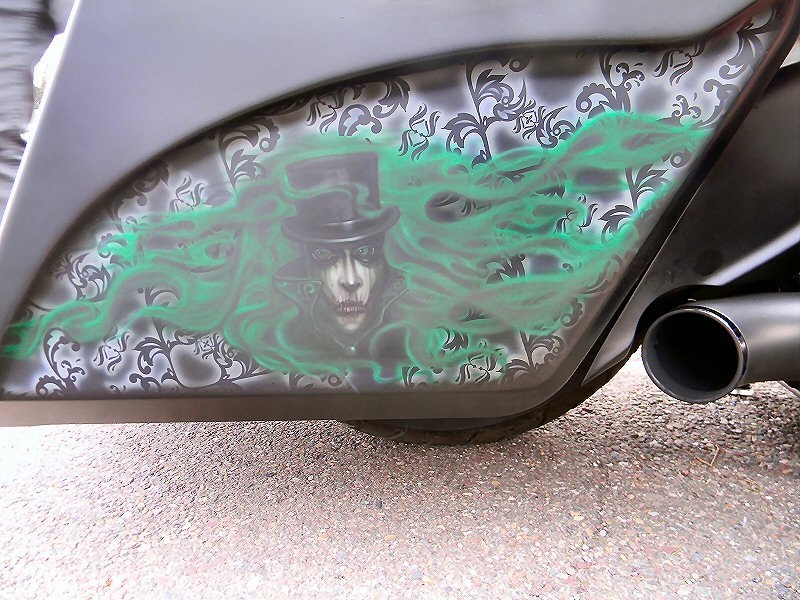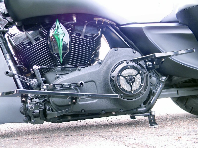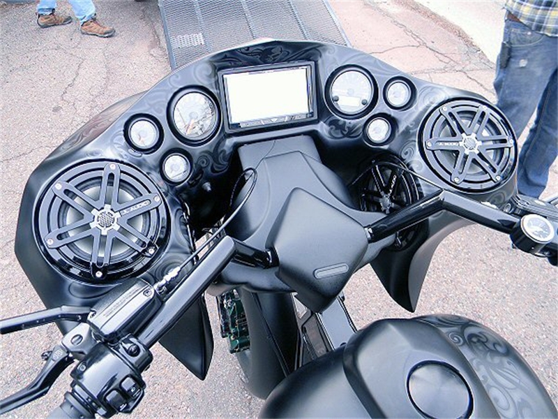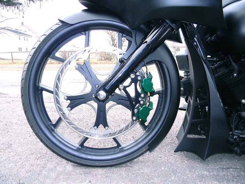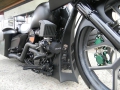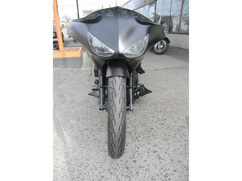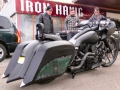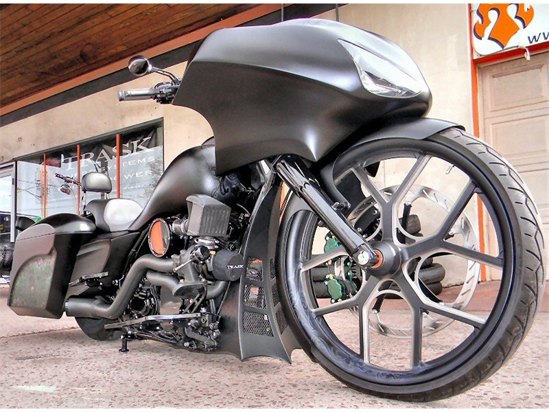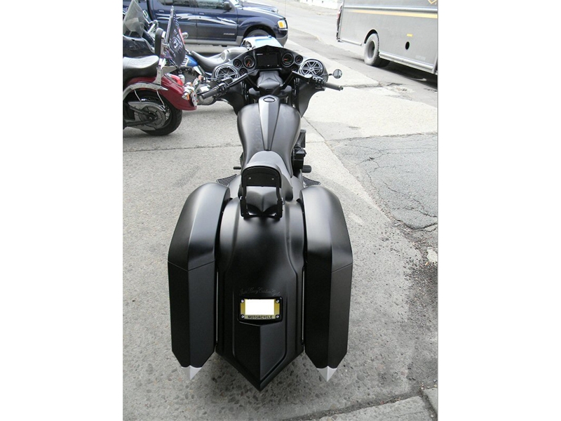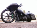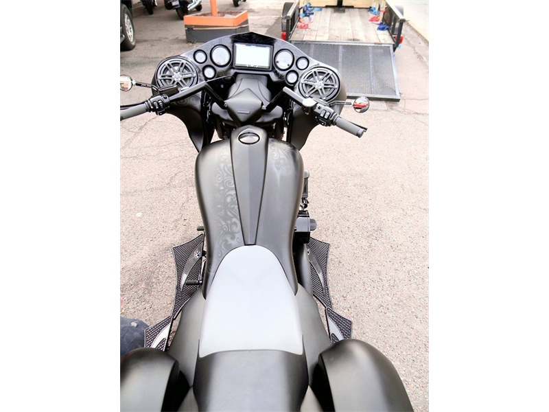 Stock frame with an American suspension short neck mod by Iron Hawg, 26” Wheel with 18” dual caliper, single rotor, and front fender by Glenndyne Design, On demand air ride suspension custom fabricated by Iron Hawg, Fairing and all body panels including bags, tank and rear fender by Ballistic Cycles heavily modified By Iron Hawg. Gauges by Medallion Instrumentation Systems, Seat by Guys Upholstery AZ, Electric Center Stand by MRI, Floorboards by Black Label Baggers, Grips, levers ands accessories by Roland Sands Designs, Stereo - Kenwood head, Amp & Speakers by JL Audio 6.5 and 7.7 speakers, Artwork by Debbie Mulnar, Paint and Bodywork by Jeff Zapatocky of Iron Hawg CCI, Bars are by Ballistic Cycles, custom powder coated in-house by Iron Hawg CCI, Engine: 96-Inch Harley Engine, with 255 Cams, with Trask turbo & intercooler system, Trask hydraulic clutch setup, Pipes part of Trask turbo system, *Hand made Air Damn by Nick Zapatocky Iron Hawg CCI