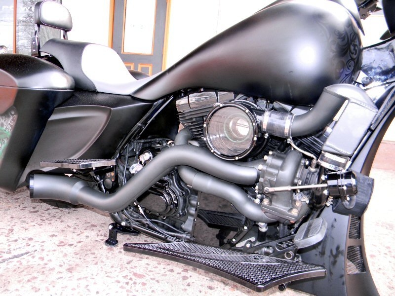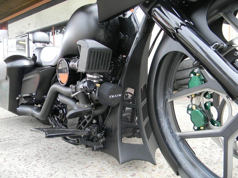 Turbo Bagger Build Pennsylvania by Iron Hawg Custom Cycles Engine: 96-Inch Harley Engine, with 255 Cams, with Trask turbo & intercooler system, Trask hydraulic clutch setup, Pipes part of Trask turbo system On demand air ride suspension custom fabricated by Iron Hawg Harley Turbo Trask turbo & intercooler system, Trask hydraulic clutch setup, Pipes part of Trask turbo system Seat by Guys Upholstery AZ