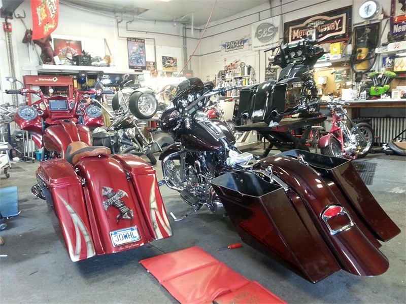 Some of the Bagger Motorcycle work we do includes: Ground-up fabrication, modifications including stretching tanks, bags and fenders, complete custom paint jobs, matching paint on fairings & bags, custom chrome, sound systems, suspension kits, anything you can think of, with a massive selection of parts available from all the top names and innovators in the industry.