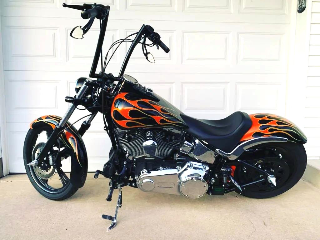 A good friend of mine is selling his custom 08 softail. It's a super hot bike that we did for him a few years ago. It's a runner too. We did an #sscycle 107 kit with 585 cams. @vanceandhines competition 2-1, tuner, heartland back end kit, Harley stretch tank, @rolandsandsdesign handlebars, @rc_components wheel, custom wrap fender,lots of custom powder coating, and of course a one of a kind Iron Hawg custom flame paint job. Way to much to list but it's a winning show bike to say the least.